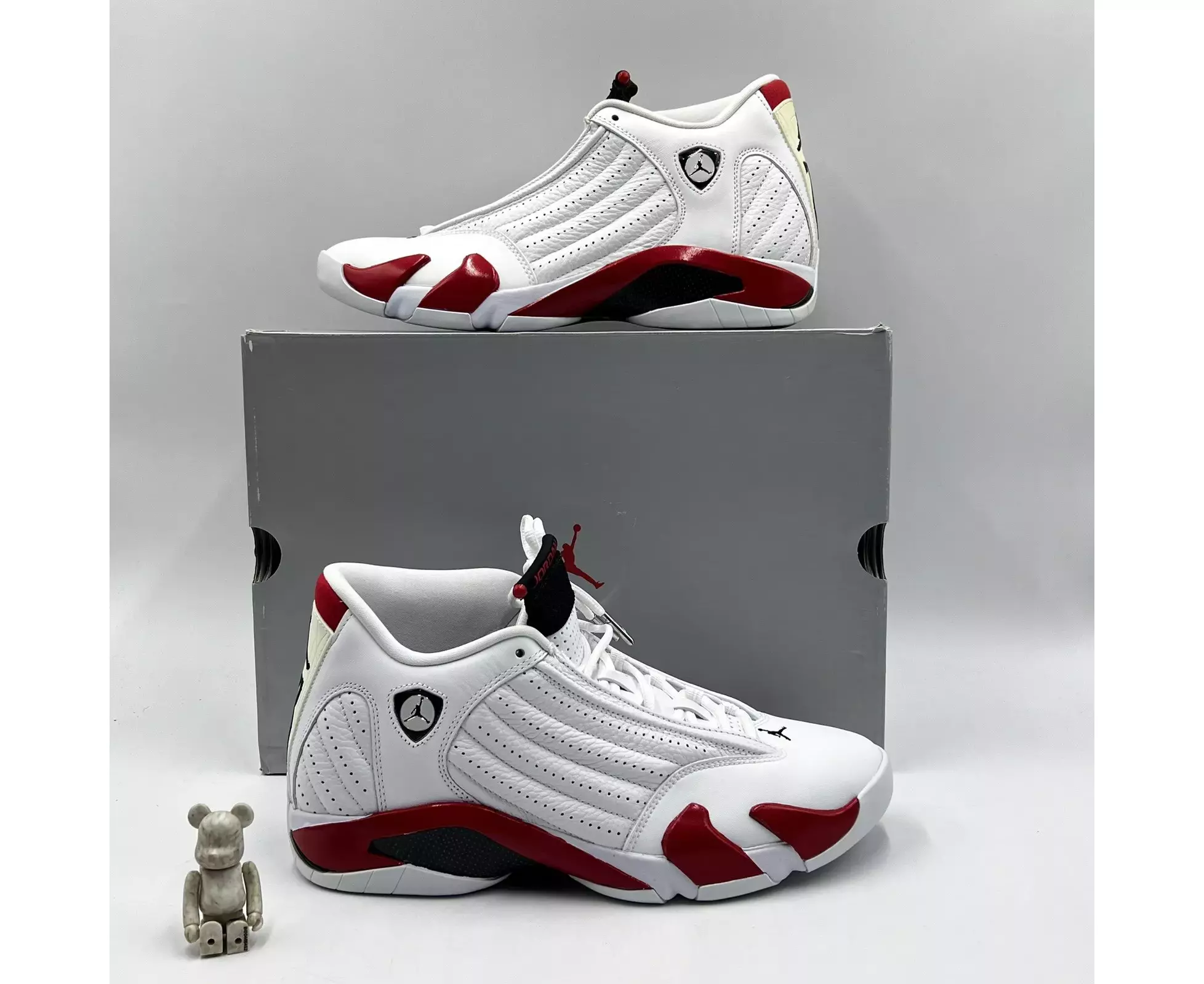 Air Jordan 14 na colorway “White/Varsity Red”. Este tênis é famoso pela inspiração em carros esportivos, especialmente o Ferrari, e é um dos modelos icônicos da linha Air Jordan, usado por Michael Jordan na sua última temporada com o Chicago Bulls.