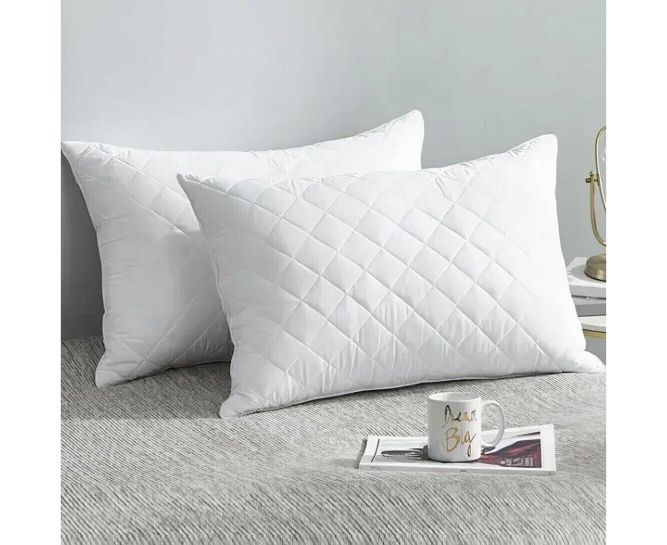 Esses travesseiros têm um invólucro externo de polialgodão acolchoado com um enchimento de fibra de bola para uma sensação de suavidade superior e não é alergênico.