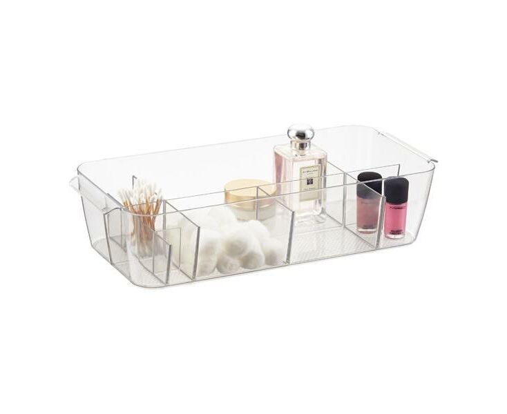 Feito de plástico resistente, a caixa para maquilhagem com compartimentos, é uma ferramenta de armazenamento perfeita para cosméticos e acessórios de todas as formas e tamanhos. As alças fáceis de transportar tornam-no conveniente para pegar, colocar e colocar embaixo da bancada.