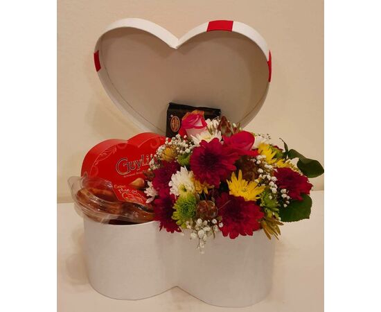 Bouquet de Flores, com pastéis de natas, e chocolate.