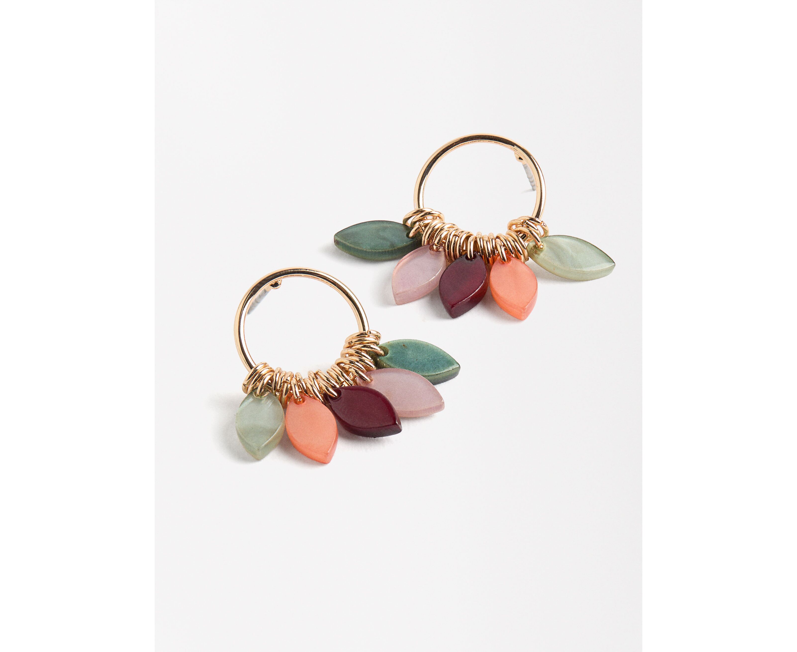 Brincos curtos com pormenores multicor em resina. Acabamento dourado.