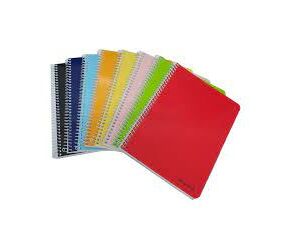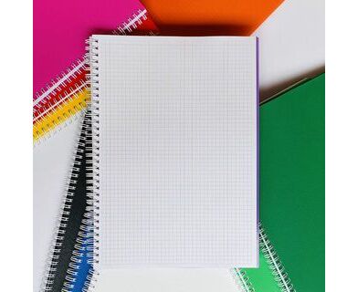 Caderno quadriculado com capa dura e uma banda de cores sortidas (preto, azul escuro, azul claro, vermelho, verde, rosa, amarelo e laranja.)