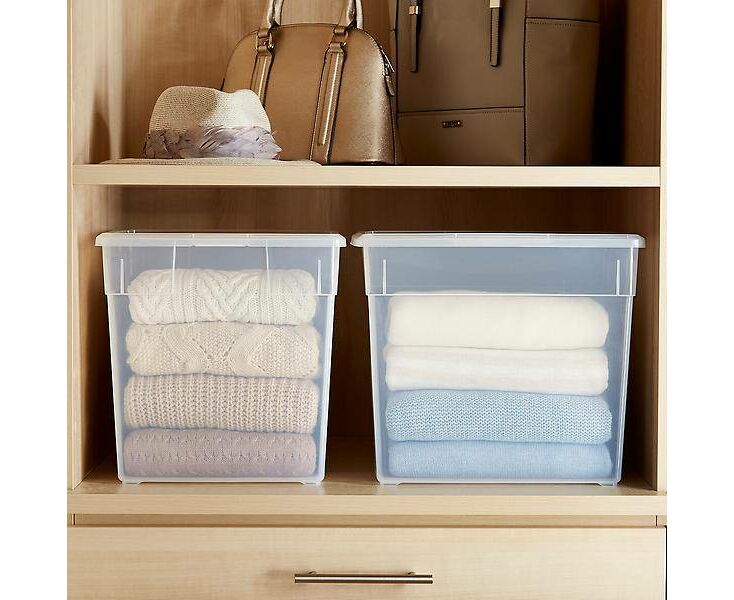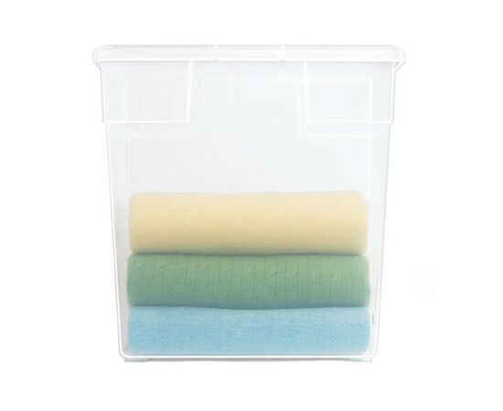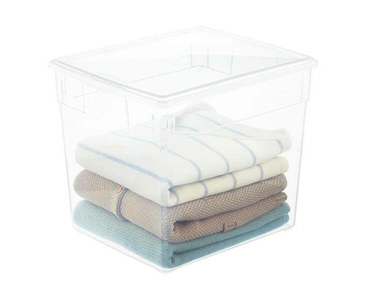 Armazene tudo, desde roupas a roupas de cama e sapatos, mantendo-os protegidos de insectos e poeira com as caixas de armazenamento transparentes. As caixas são feitas de polipropileno transparente e inquebrável para fornecer visibilidade descomprometida do conteúdo. Cada caixa possui uma tampa com fecho de fácil abertura. A coleção inteira é modular para empilhar com segurança e faz o uso mais eficiente do espaço do seu armário.