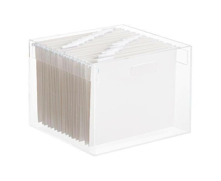 Caixa de arquivo suspenso de acrílico empilhável pode ser usada para armazenar arquivos suspensos de tamanho carta em uma mesa ou em uma prateleira de escritório.