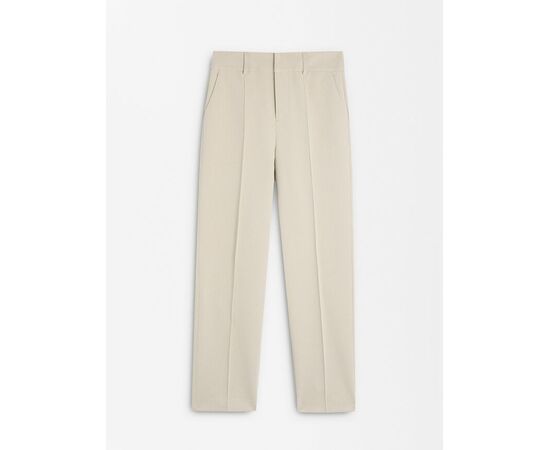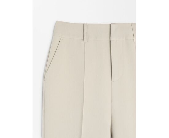 Calças retas com presilhas. Fecho com botão e fecho de correr. Bolsos laterais. Pormenor de costura marcada à frente.