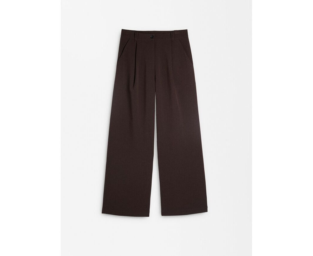 Calças fluidas retas com pinças. Abertura com botão e fecho de correr. Bolsos laterais. A modelo mede 1.73 cm e veste o tamanho XS.