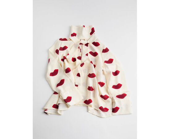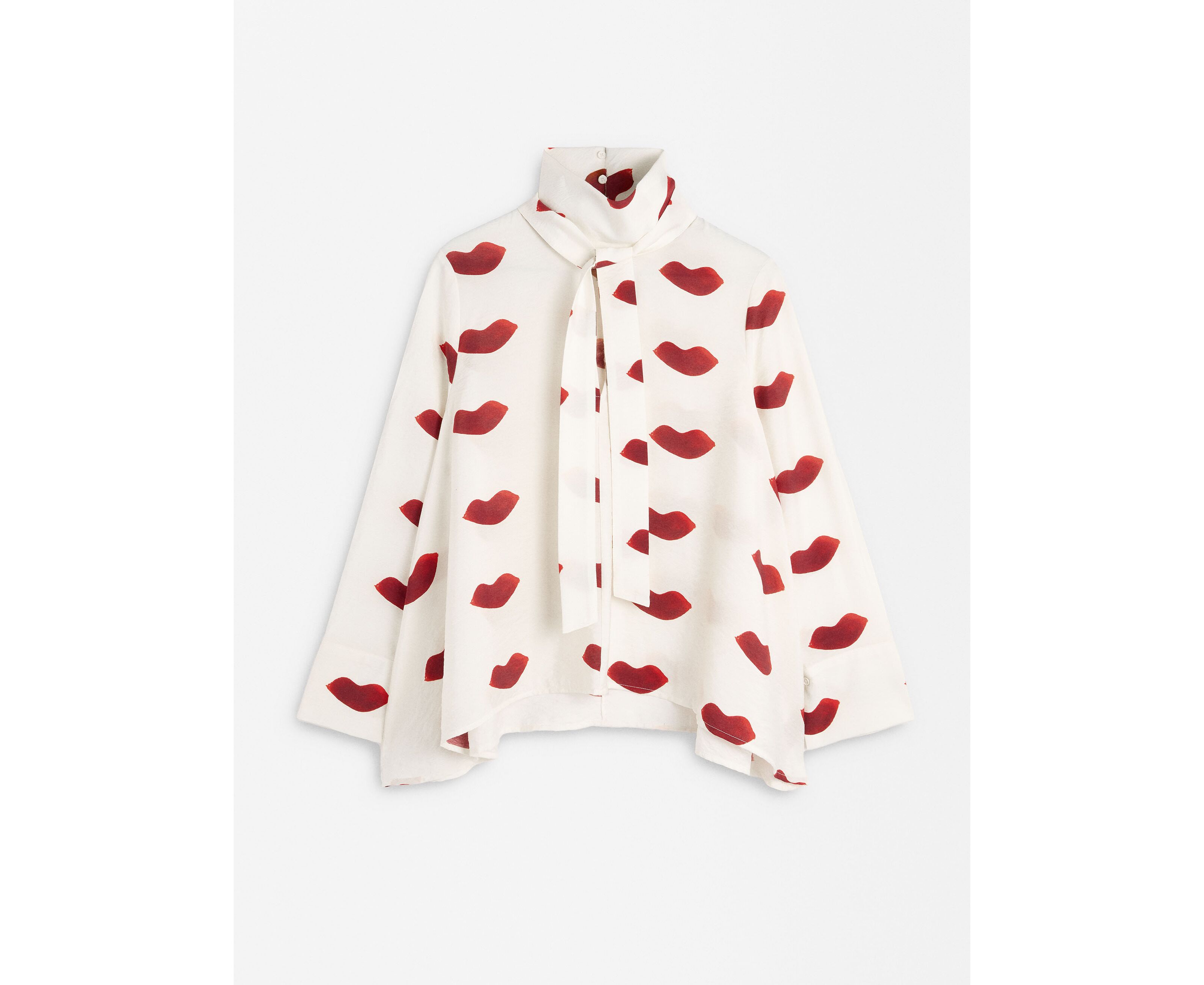 Camisa estampada com gola alta e tiras para laço. Abertura frontal superior e posterior. Manga comprida. Fecho com botões na parte posterior. Efeito enrugado. A modelo mede 1.76 m e veste o tamanho XS-S.