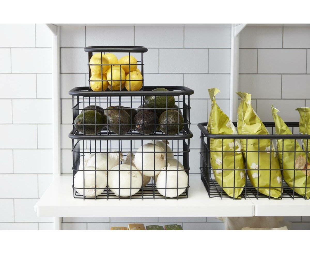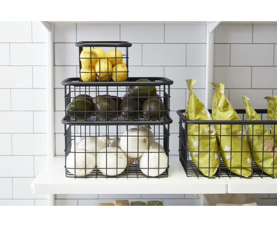 Feitas de metal e com acabamento em revestimento preto fosco, cada cesta apresenta um design de arame aberto e alças integradas. A base plana assenta com segurança nas prateleiras. Uma saliência interna especial permite um empilhamento sem preocupações. Com uma variedade de tamanhos, essas cestas de arame podem ter várias utilizações, desde organização de escritório, lavandaria e armazenamento de despensa para itens a granel. Eles também ficam perfeitamente em casa ao ar livre, onde ajudam a maximizar o espaço na entrada ou na sala de estar.