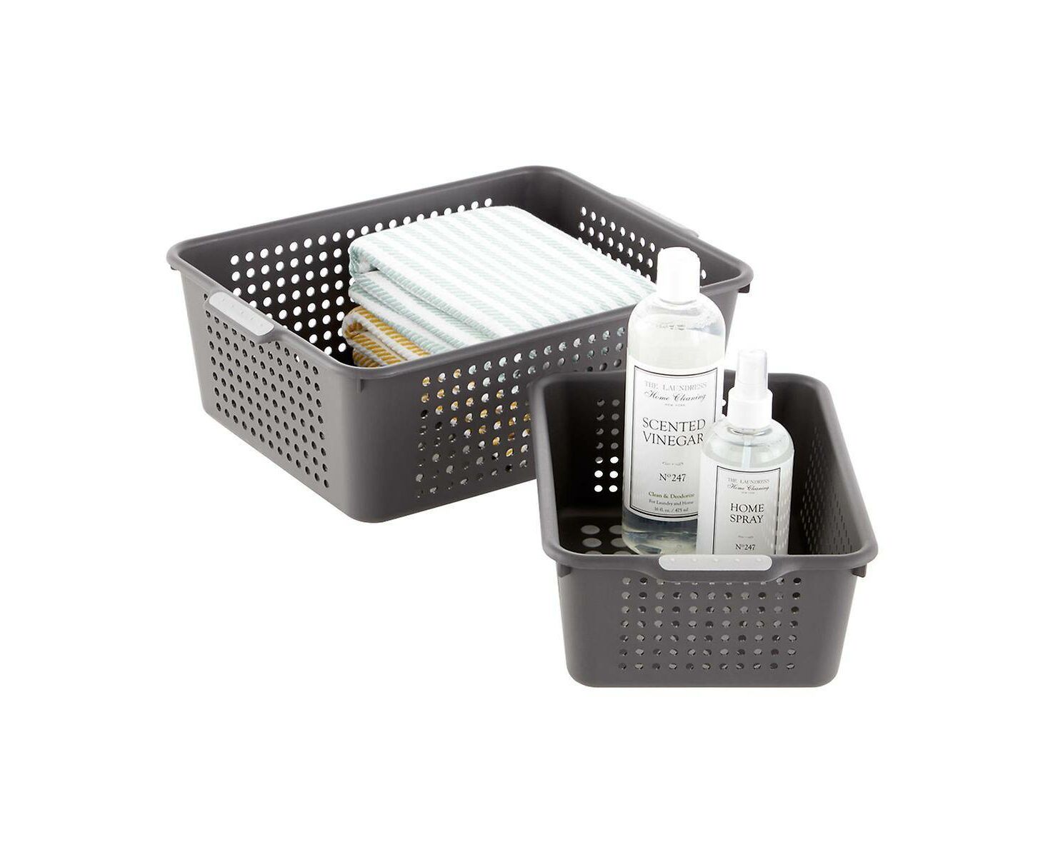 Organize os armários e as áreas sob o lava-loiça com estes cestos projectados para se adequarem ao espaço disponível e tolerarem água e outros elementos laváveis. Feita para ser durável e atraente, cada cesta é forrada com um material macio e aderente, que mantém o conteúdo no lugar. Na base, pés de borracha antiderrapantes evitam o deslocamento. Os cantos arredondados facilitam a limpeza.