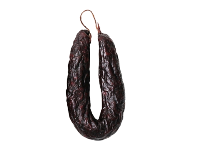 Elaborado com carne, gordura e sangue de suíno, cebola, vinho (Sulfitos), sal, e especiarias, é ultimado no fumeiro com lenha de azinho.