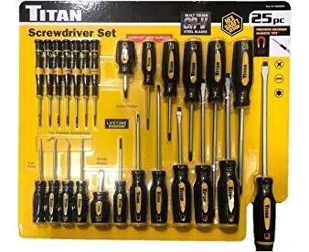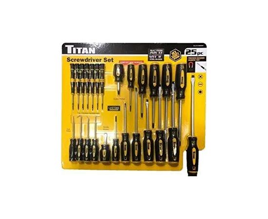 Este conjunto de chaves de fendas Titan de 25 peças, oferece uma ampla variedade de chaves de fenda com: fenda, estrela, Phillips e quadrada com alças ergonómicas. O conjunto inclui 14 chaves de fenda padrão e 7 chaves de fenda de precisão.