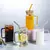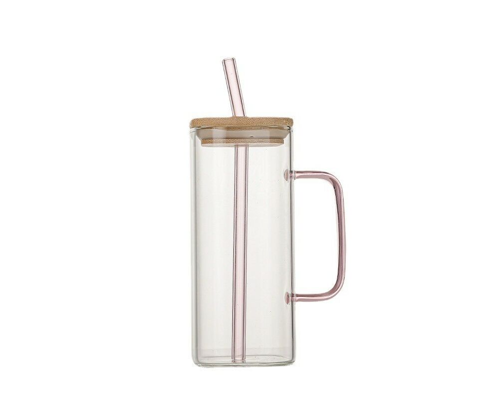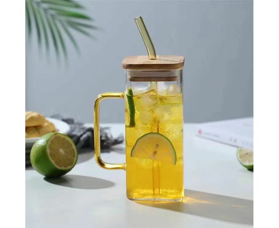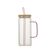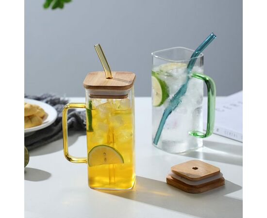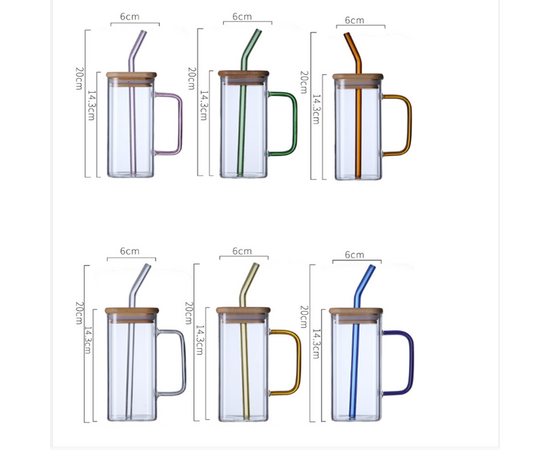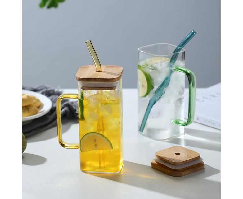 Copos de vidro bonitos com alça, tampa de bambu e canudo.
