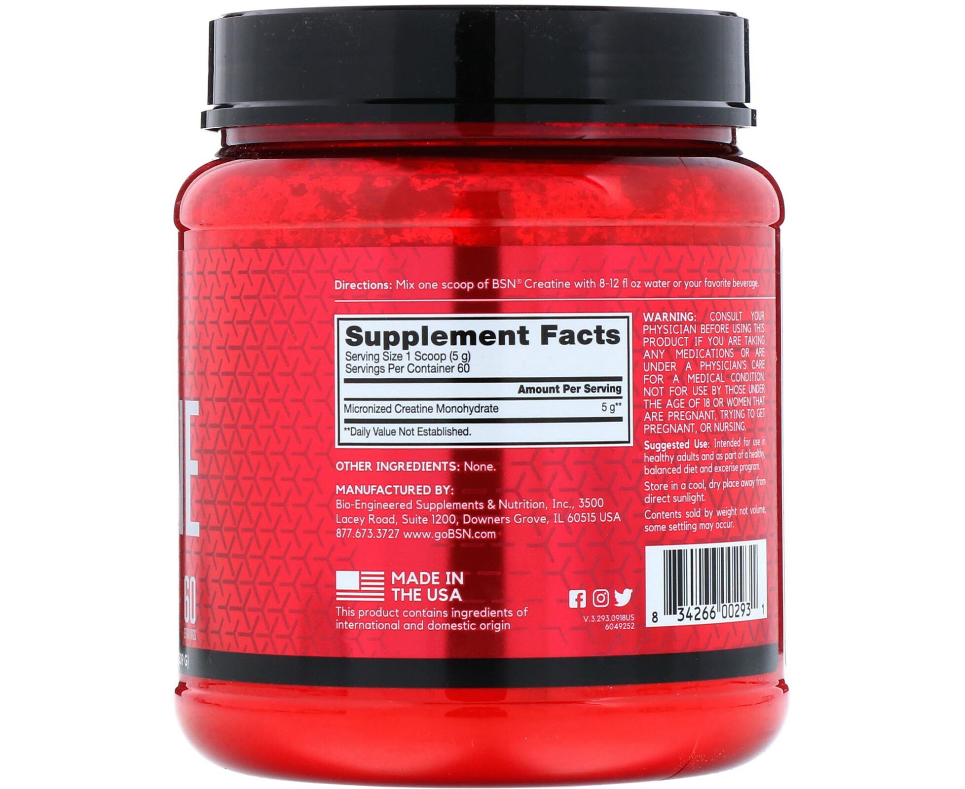 Cada porção de creatina BSN contém 5g de monohidrato de creatina micronizada para dissolver facilmente em líquido.