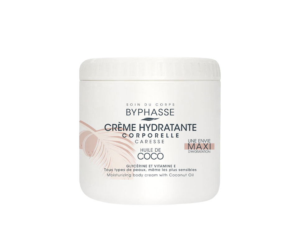 O creme hidratante corporal com óleo de coco em formato de 500 ml, formulado com glicerina, manteiga de karité e enriquecido com vitamina E, hidrata a pele.