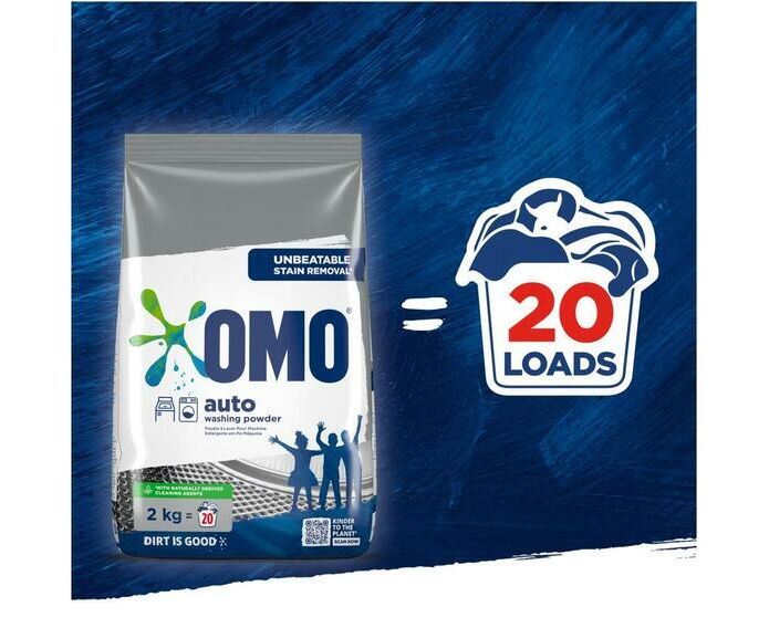 Este é um pacote de OMO Auto Washing Powder de 2 kg, um detergente em pó para máquinas de lavar, conhecido pela sua eficácia na remoção de manchas.