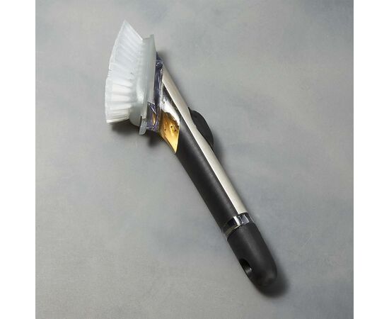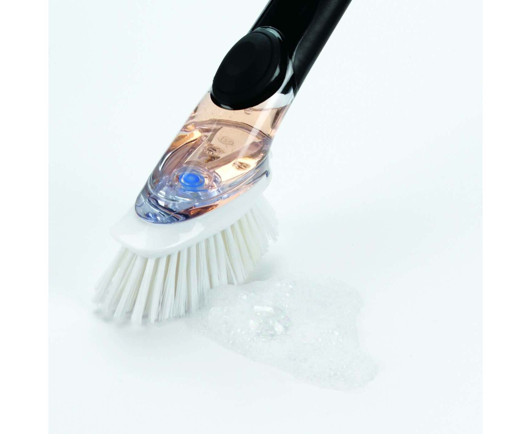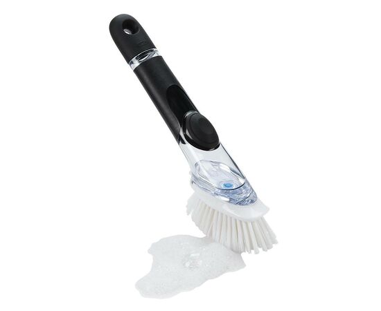 Basta premir o botão para dispensar o detergente para a loiça através das cerdas desta prática escova. Encha a alça do reservatório através do botão dispensador. O punho macio permanece antideslizante mesmo quando molhado. As cerdas fortes, mas suaves, super duráveis, removendo os resíduos de pratos, copos, potes e panelas sem riscar.