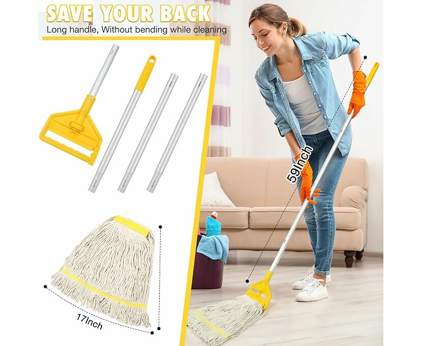 - Cabo longo premium: Nossos esfregões industriais para limpeza de pisos utilizam um cabo de alumínio reforçado, mais resistente e durável em comparação com outros esfregões. O cabo de 140 cm de comprimento permite que você fique em pé confortavelmente durante a limpeza, reduzindo a pressão na cintura.