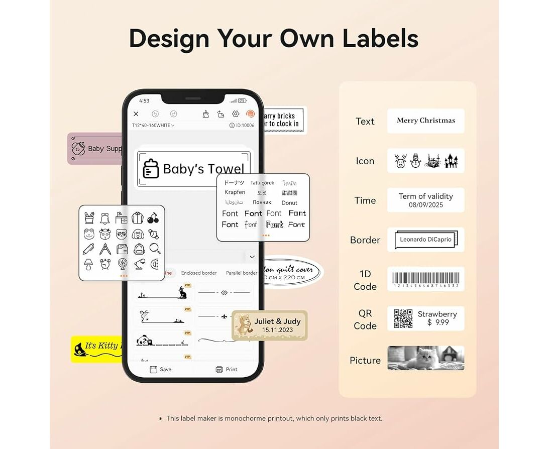 - Funções poderosas: Suporta a impressão de vários textos, números, gráficos, símbolos, logotipos, códigos de barras, códigos QR, etc. E reconhecimento inteligente de vozes e imagens.