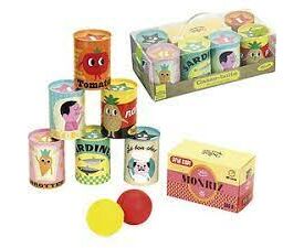 A ideia de jogo é ver quem deita a baixo mais latas. Comecem por montar a torre de latas e depois, com as 2 bolas de espuma derrubem as caixas de tomate, sardinha, abacaxi etc. Cada lata tem um número e podemos usá-los como pontos, assim sendo quem conseguir mais pontos ou derrubar mais latas ganha o jogo!