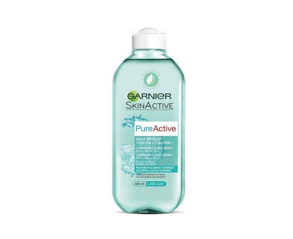 Água Micelar Pure Active de Garnier, é ideal para peles mistas, oleosas e sensíveis, com poder matificante. Serve para remover a maquiagem e limpar a pele, eliminando impurezas, graxa e sujeira, reduzindo também o brilho.