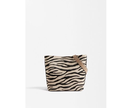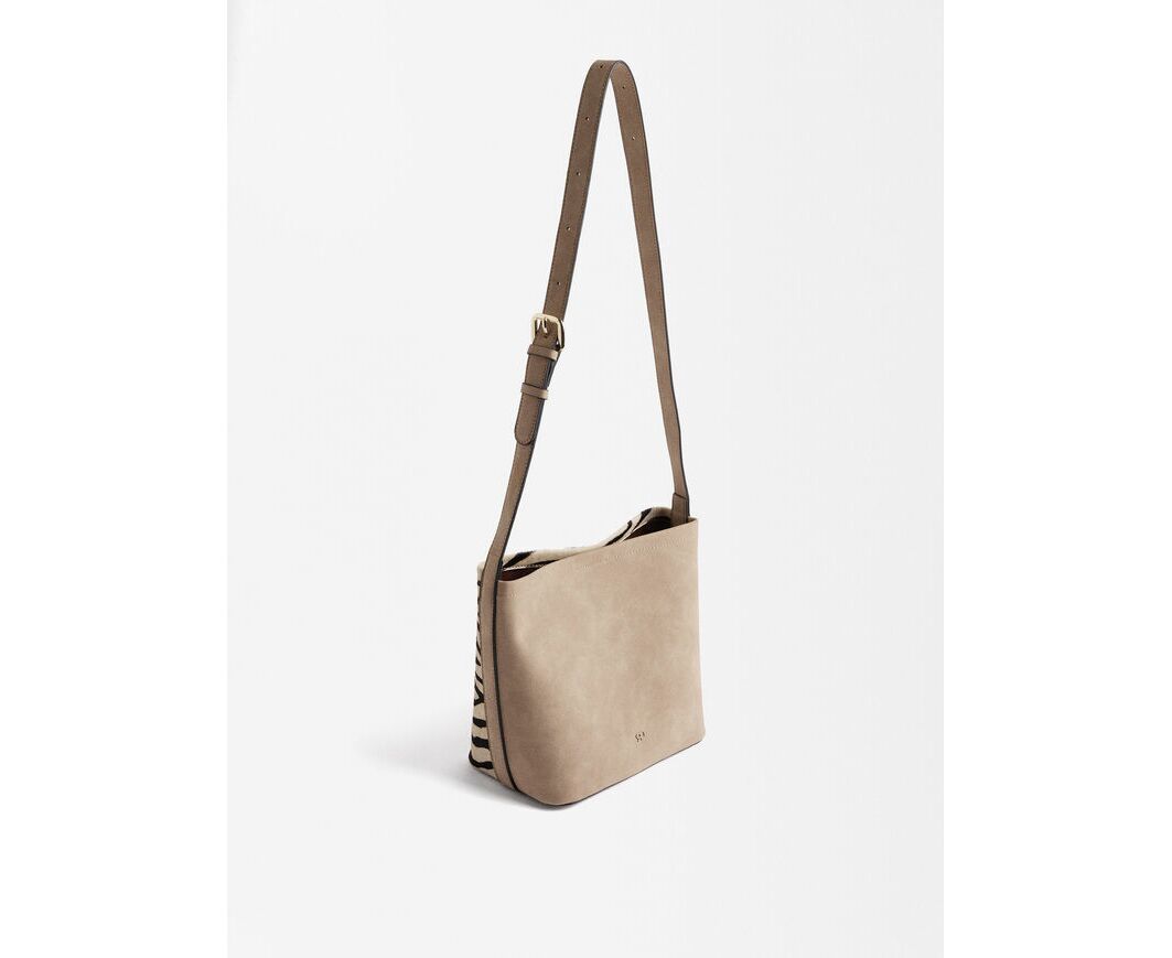 Mala bucket com pele. Bolso interior removível e com fecho de correr. Fecho principal com íman. Alça fixa ajustável.