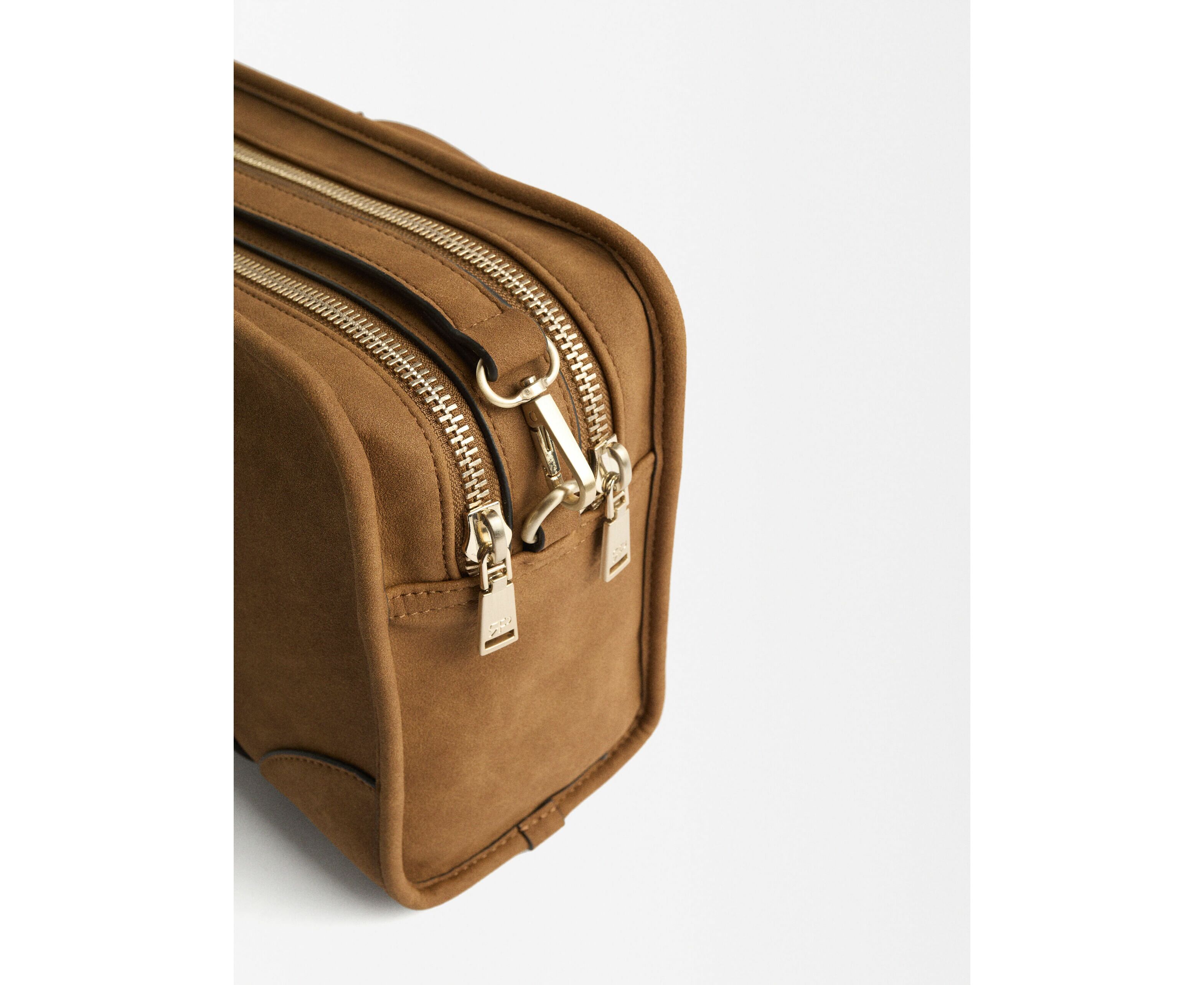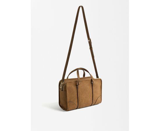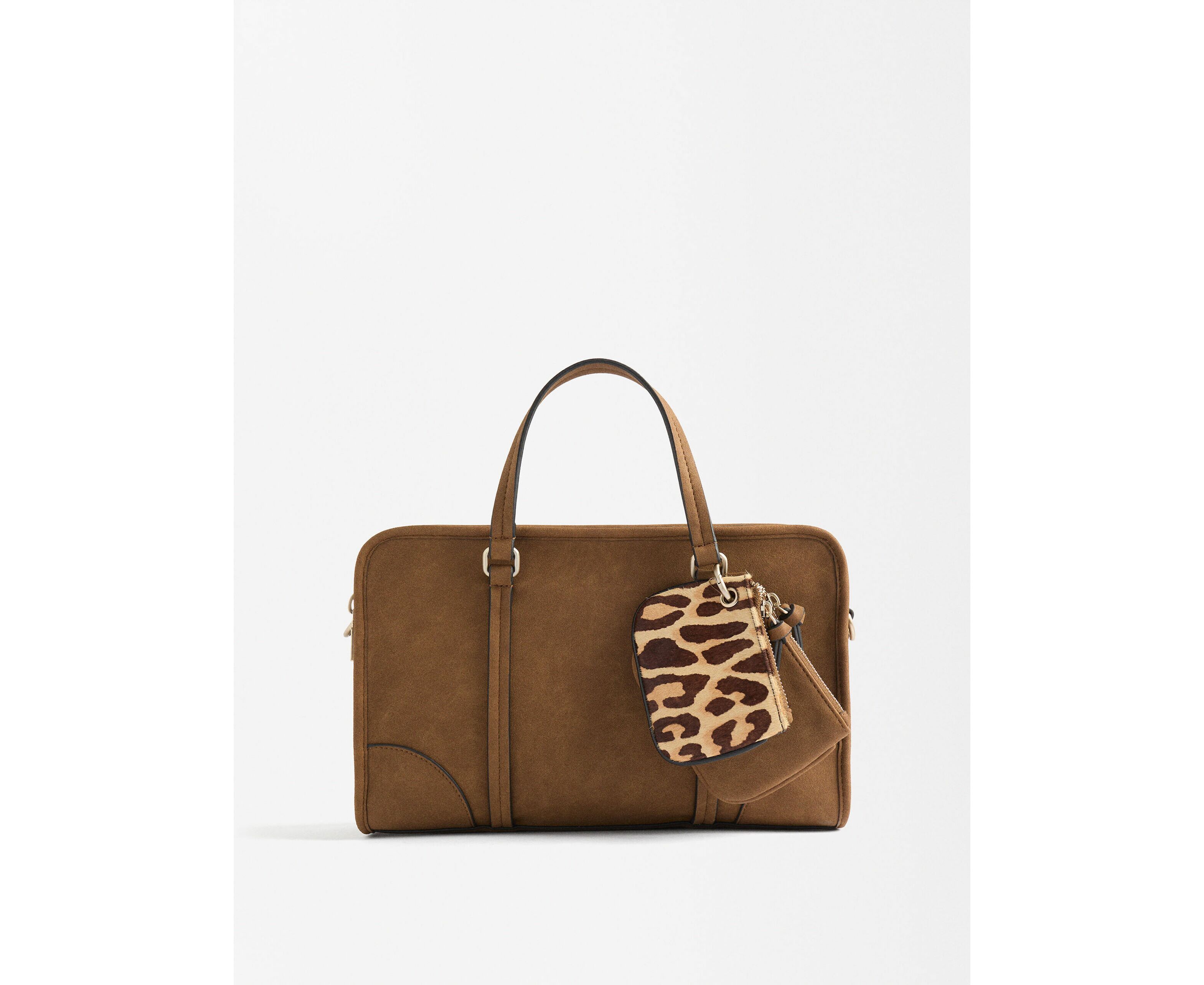 Mala tote com efeito pele. Penduro de pele com estampado de leopardo. Duplo fecho de correr. Alças de mão fixas. Alça tiracolo ajustável e removível. Forro e bolso interior.