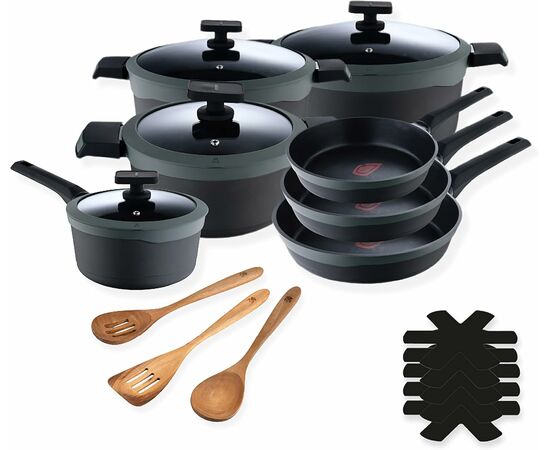 - Conjunto completo e versátil: Este conjunto também vem com 3 utensílios de cozinha essenciais, uma espátula com fendas, uma colher de cozinha e 1 colher com fenda. Também incluímos um protetor para panelas, completando o conjunto e garantindo que tenha tudo o que precisa para preparar as suas refeições com facilidade e conforto.