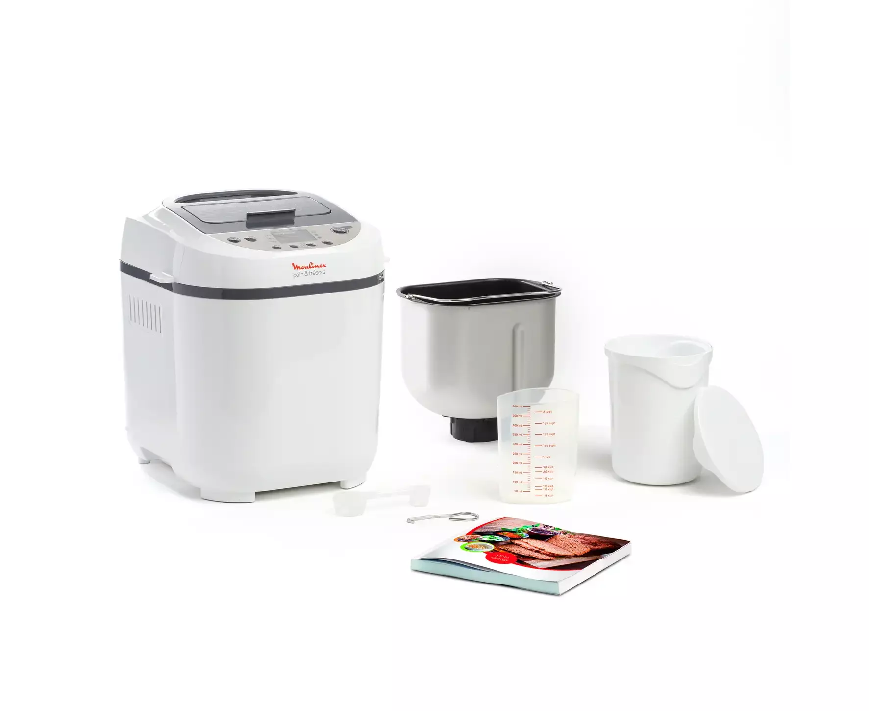 Máquina de pão Pain & Tresors: mais do que apenas pão caseiro! Faça facilmente pão caseiro, pizza, papas, cereais, iogurte e muito mais, graças aos seus 20 programas automáticos! 3 programas de fabrico de pão sem glúten: Pão salgado sem glúten / Pão doce sem glúten / Bolo sem glúten. 7 programas de pão: Pão integral rápido / Pão integral / Pão sem sal / Pão super-rápido / Pão de centeio / Pão francês / Pão doce. 7 outros programas: Massa levedada / Bolo / Massas / Só para cozinhar / Papas / Cereais / Compotas. 3 programas de lacticínios: Iogurte / Iogurte líquido / Queijo cottage.