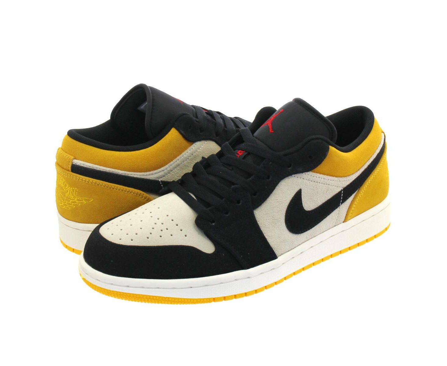 A parte superior de corte baixo do sapato inclui uma camurça completa construída em uma mistura de ouro e preto, com a marca Gym Red acentuando a língua