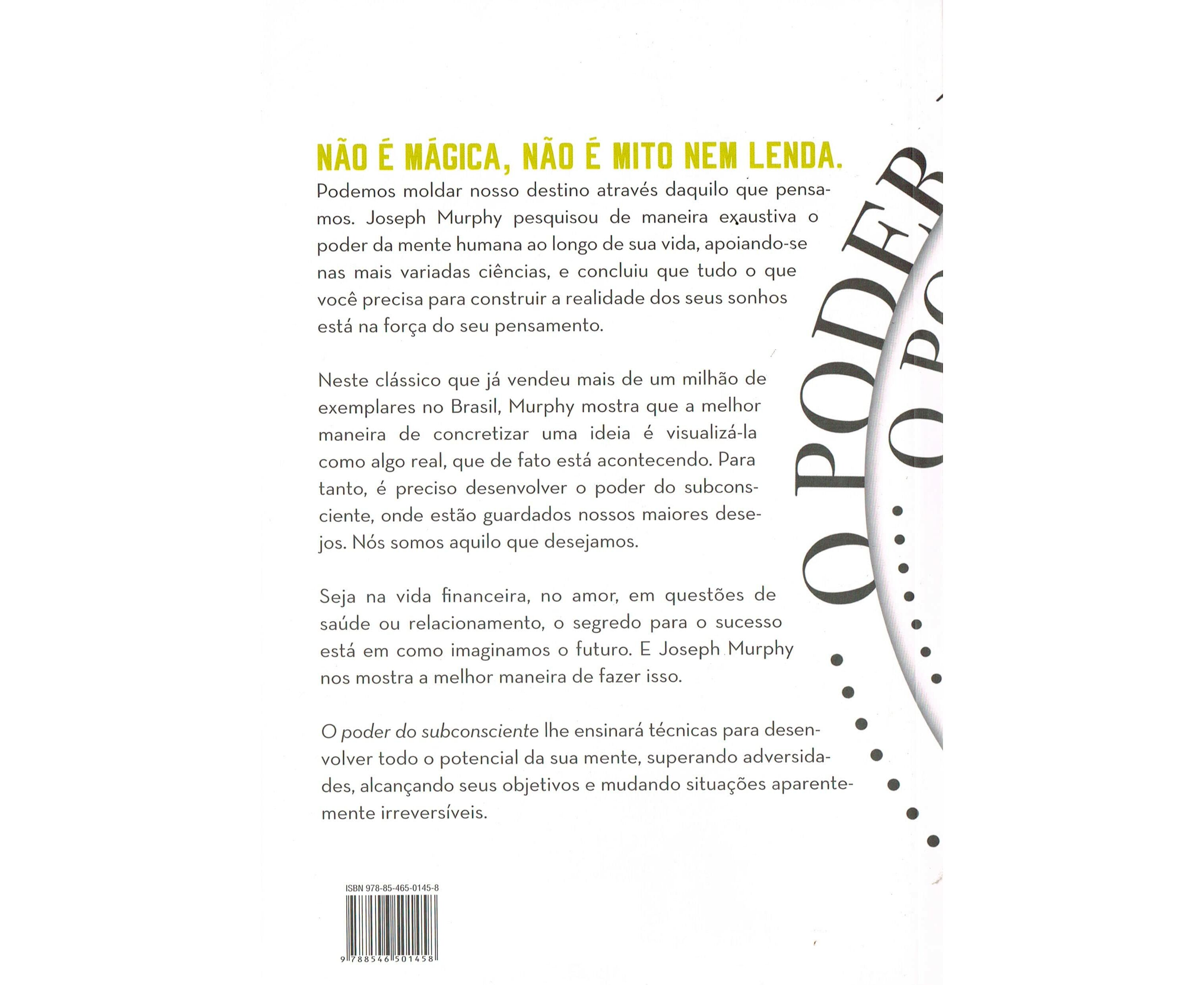 O poder do subconsciente ajudou milhões de pessoas a alcançarem grandes objetivos apenas mudando a maneira de pensar. As técnicas revolucionárias descritas pelo Dr. Murphy baseiam-se em um princípio simples e prático: se você acredita em algo sem restrições e faz um retrato disso em sua mente, remove os obstáculos subconscientes para que seu desejo se concretize. Assim, qualquer um pode transformar em realidade aquilo em que acredita.