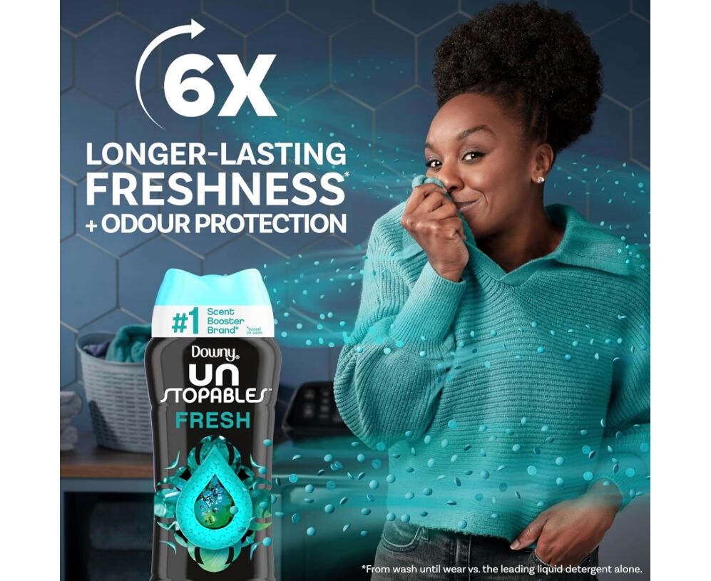As contas Downy Unstopables In-Wash Scent Booster oferecem até 12 semanas de frescura.