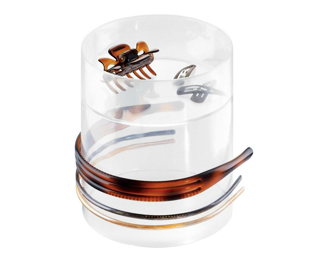 Evite que suas bancadas e gavetas sejam atropeladas por acessórios de cabelo com o porta-acessórios de cabelo iDesign. Com um compartimento curto e um compartimento alto, ele é especialmente projetado para acomodar tudo; desde escovas e bandoletes a punhos e ganchos. O plástico transparente combina com qualquer decoração e torna mais fácil ver exatamente o que você está procurando.