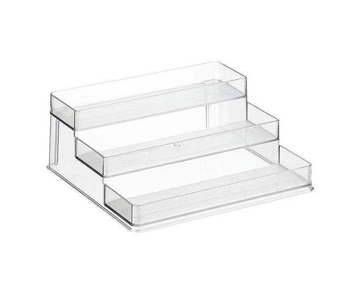 Organize seu armário de temperos, ou de remédios, com a prateleira acrílica de três níveis da iDesign. É perfeita ver facilmente cada nível e encontrar o item que procura com facilidade. Cada tem uma borda para evitar que o conteúdo caia da prateleira.