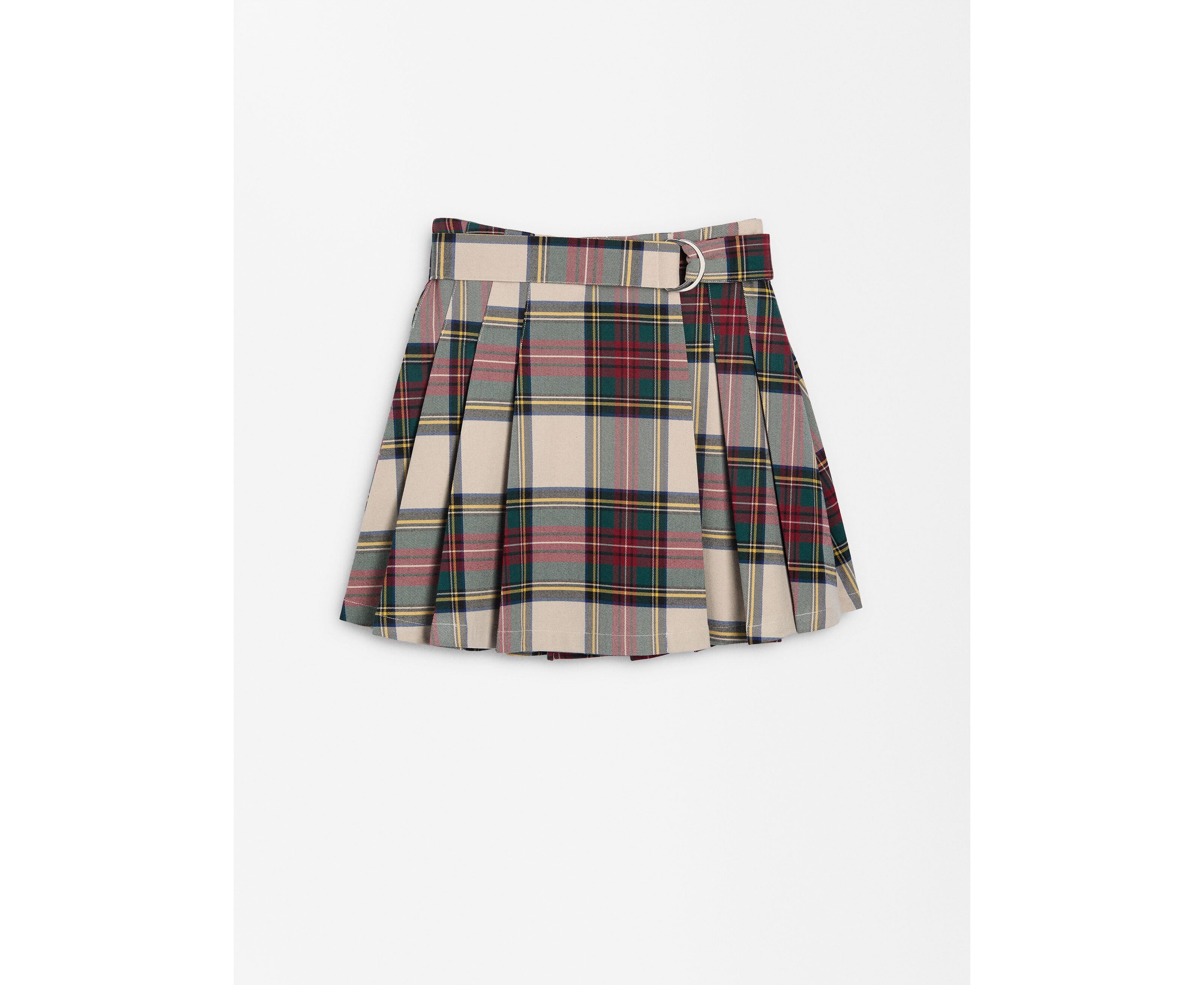 Saia curta plissada com estampado de quadros. Fecho com botão. Cinto no mesmo tom com fivela de argola. A modelo mede 1.76 m e veste o tamanho XS-S.