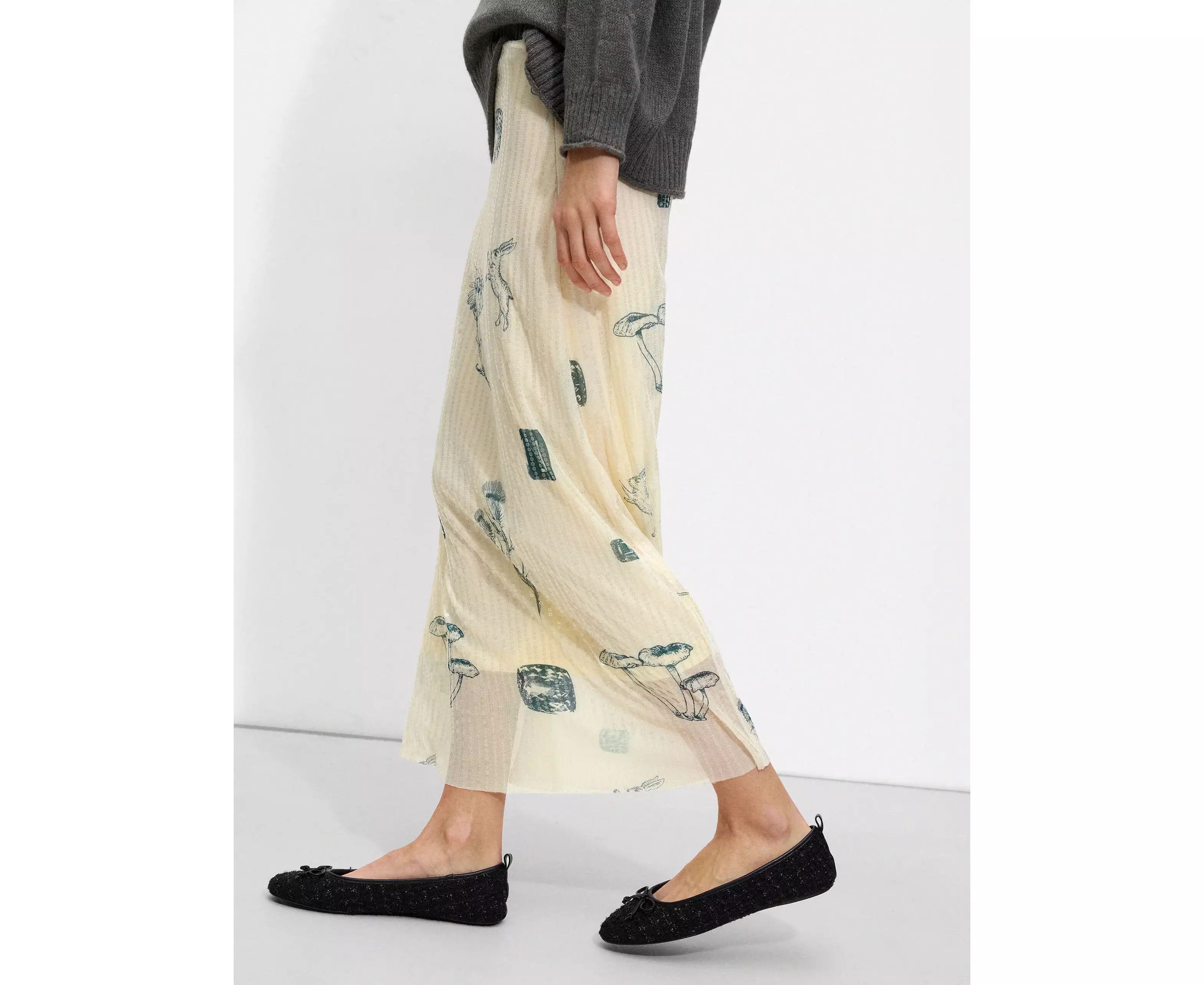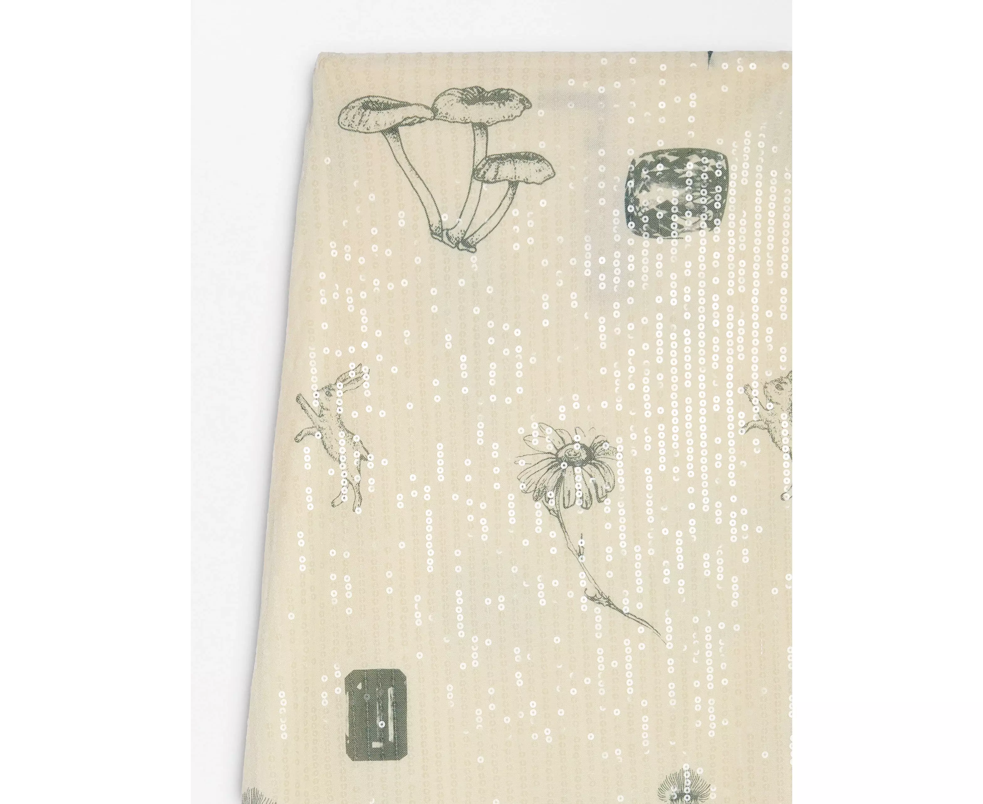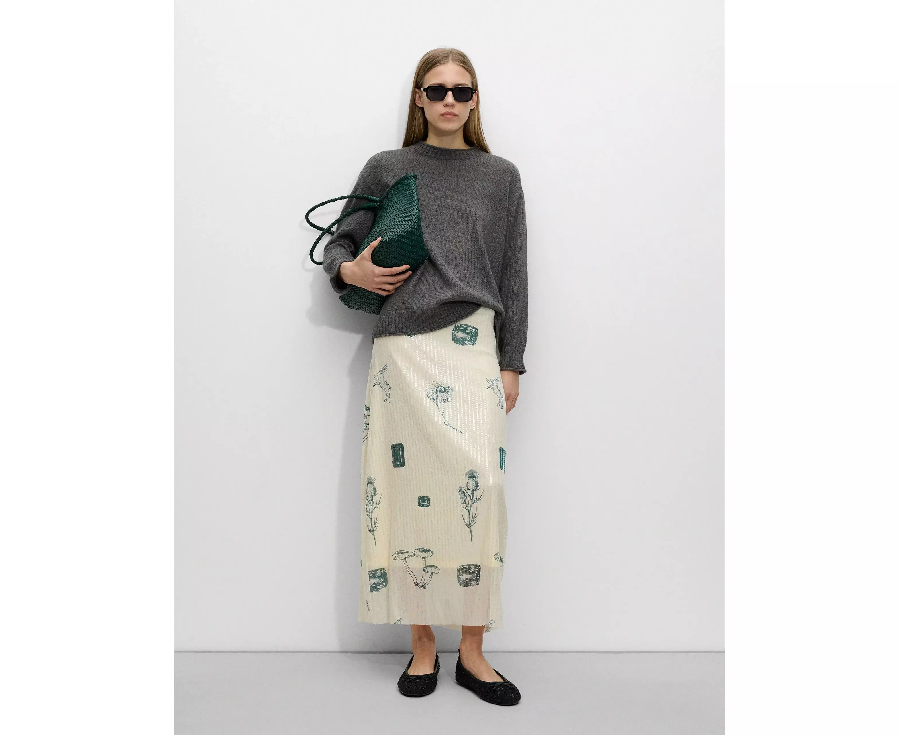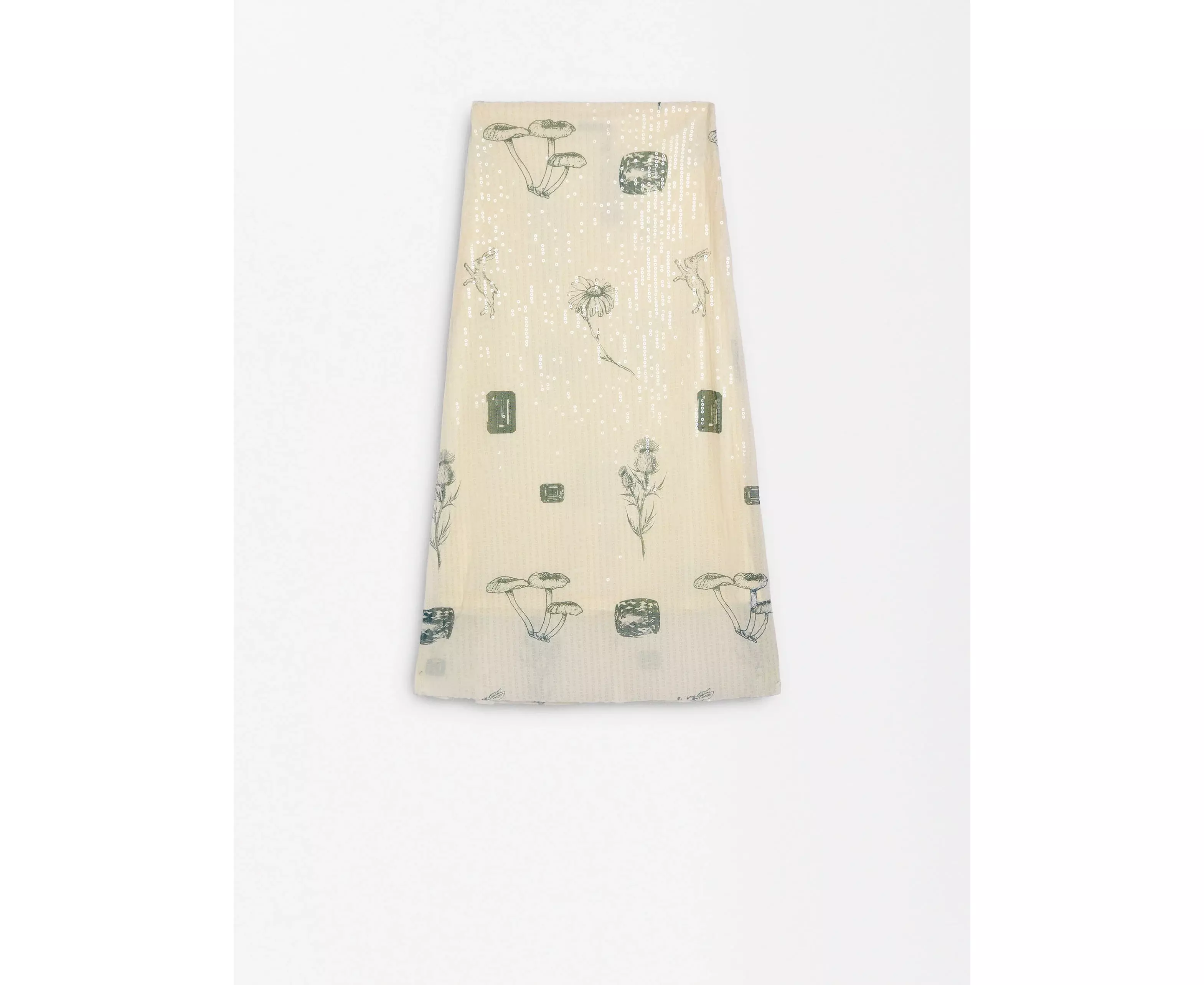 Saia comprida estampada, com lantejoulas. Forro interior. Fecho de correr lateral. Abertura posterior inferior. A modelo mede 1.75 m e veste o tamanho S.