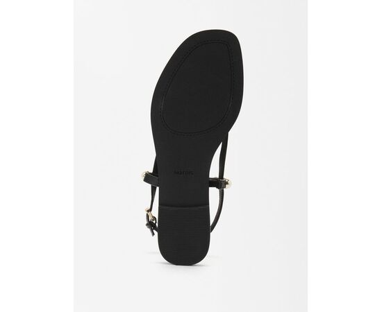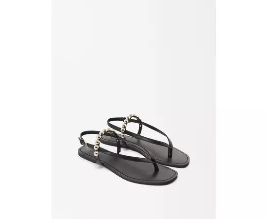 Sandalia de finas tiras monocromática com detalhe central de contas metalizadas. Fivela ajustável ao tornozelo.
