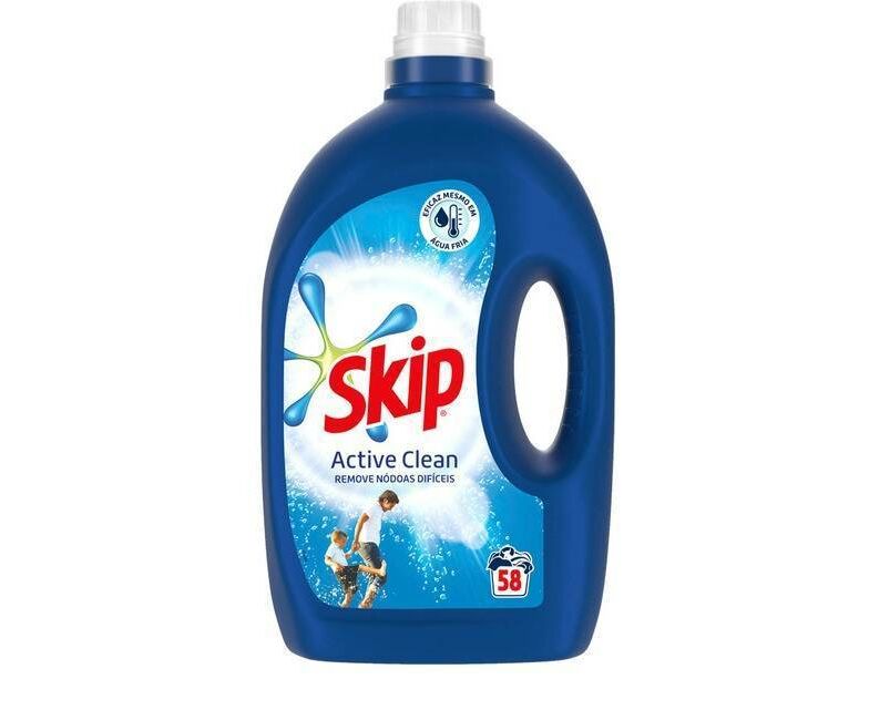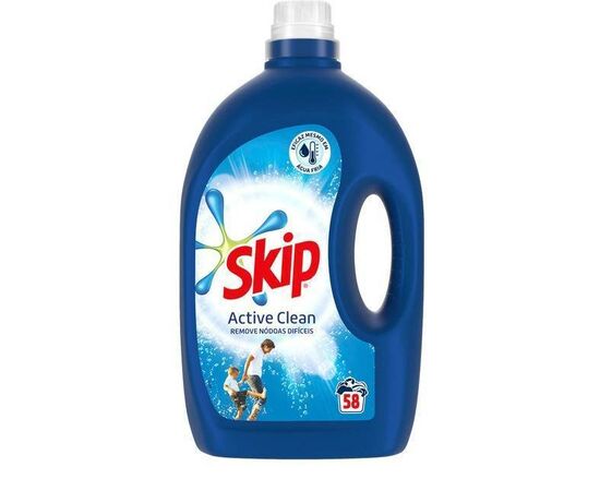 Skip - Active Clean remove mais nódoas difíceis, mesmo em ciclos curtos e agua fria. Dissolve-se facilmente na lavagem. Indicado para roupa de fibra e cores delicadas.