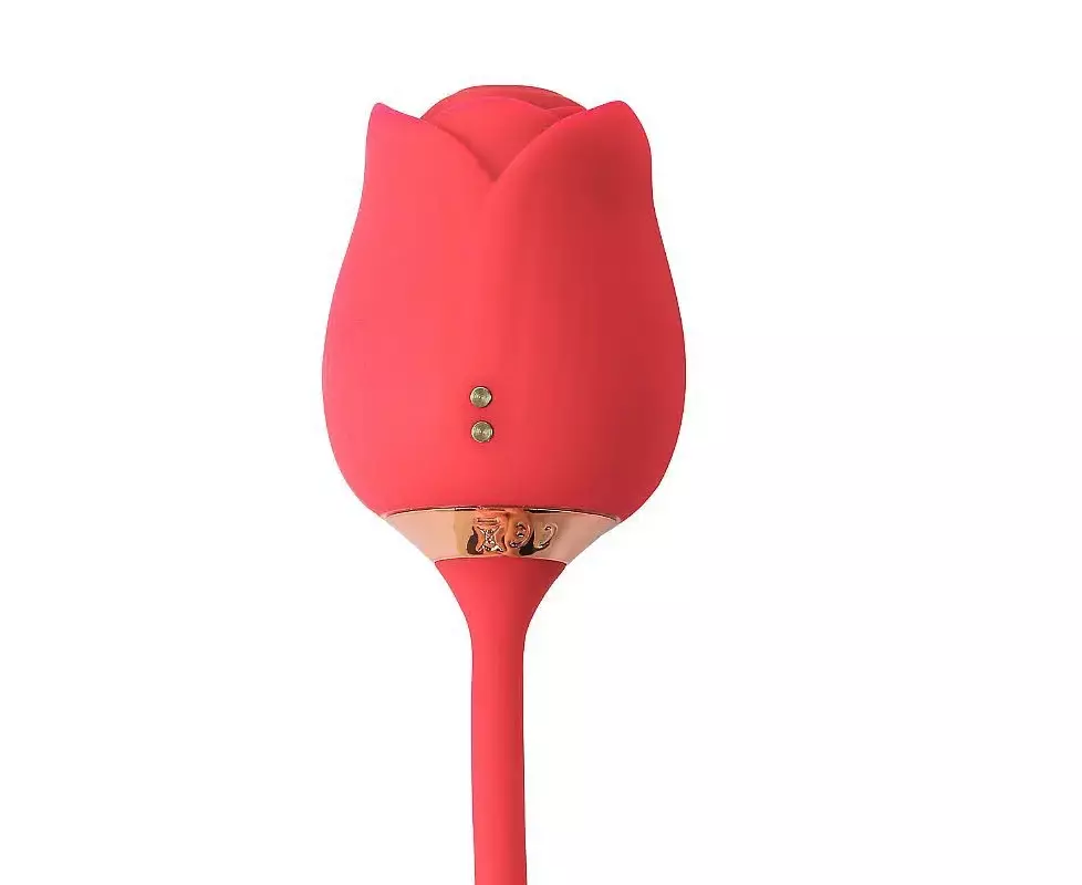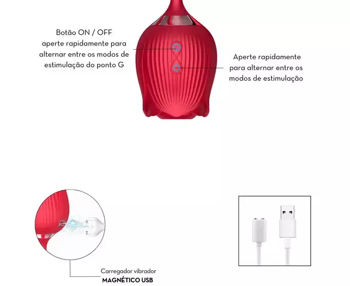 Estimulador clitoriano duplo em formato de flor, sendo: Um estimulador por ondas de pressão em formato de flor e um estimulador do ponto G. Possui toque suave, aveludado e detalhes metalizados. Bateria: Recarregável USB (cabo magnético incluso)