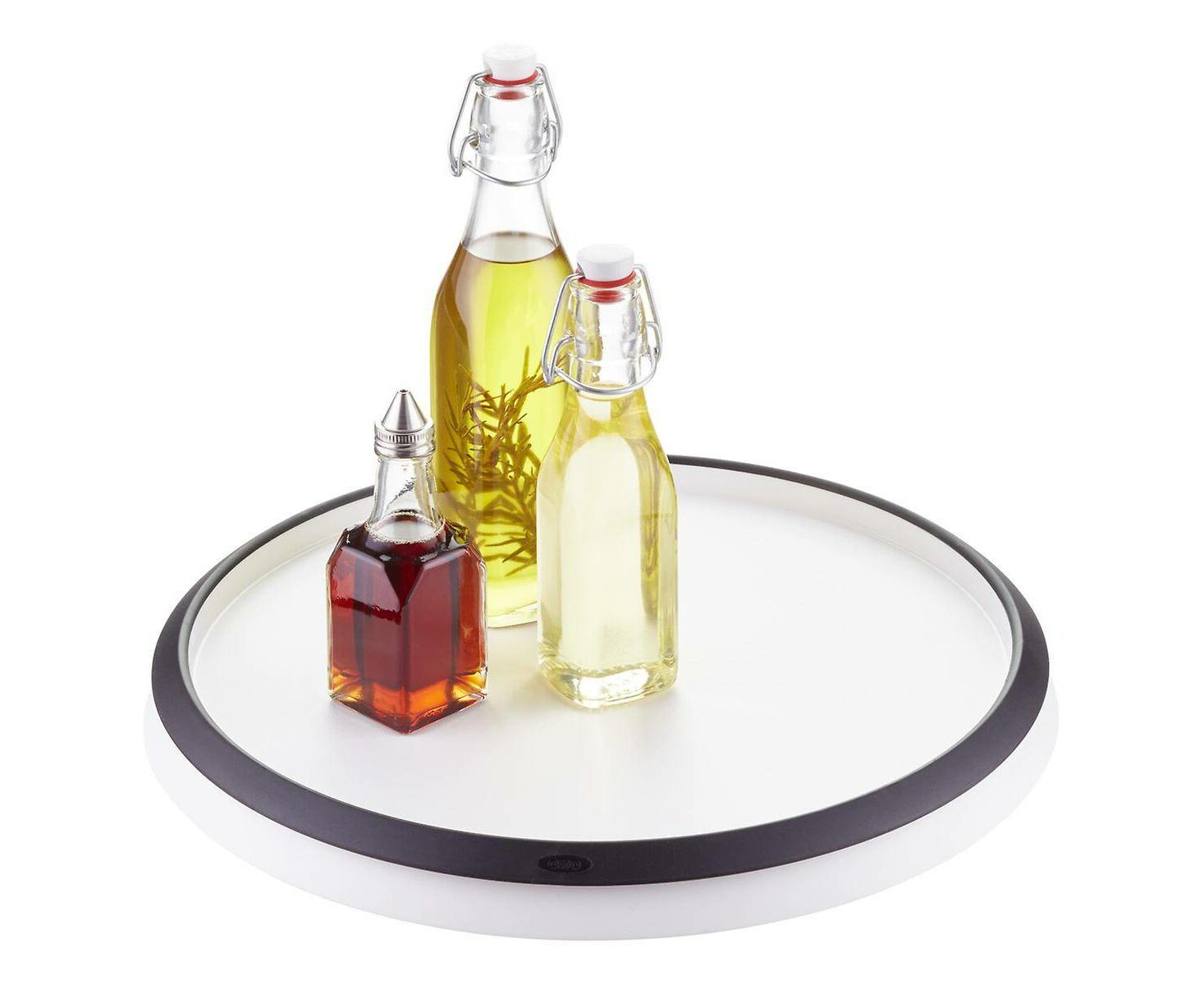 Os tabuleiros giratórios da OXO Good Grips são projetados para ajudar a maximizar o espaço nas prateleiras e armazenar o conteúdo para que esteja acessível. A base ampla e pés antiderrapantes fornecem estabilidade. Uma borda elevada evita que os itens caiam. Prático para organizar despensas, também é atraente o suficiente para colocar em um balcão ou á mesa de refeição.