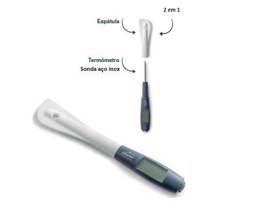 - termómetro e espátula. Range de temperatura de 50ºC até 300ºC. Sonda em aço inoxidável e espátula de silicone. Livre de BPA e 100% seguro para uso culinário. Dimensão 25 cm.