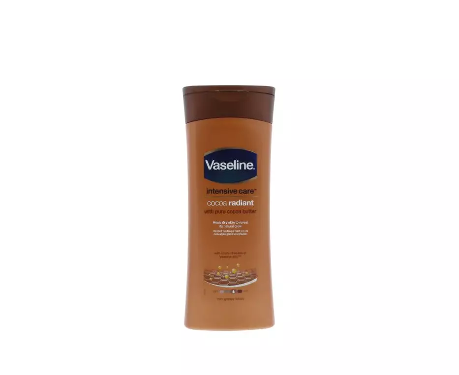 A loção corporal radiante de cacau vaselina é feita com menteiga de karité e cacau puro, conhecida por revelar o brilho natural da pele.